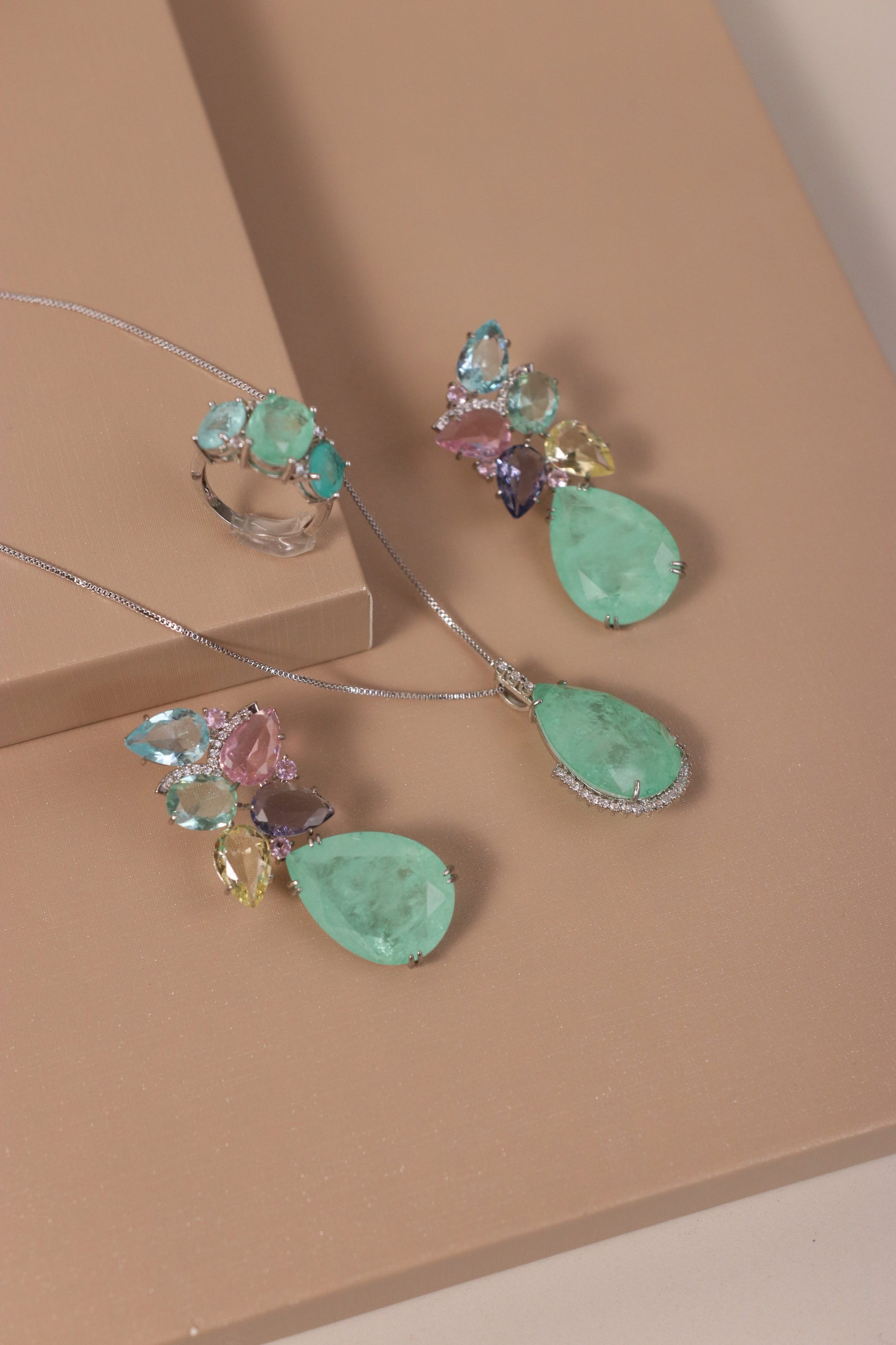 Composto por colar, brincos e anel, esse design é marcado por uma gota central verde em tom intenso, acompanhada por pedras multicoloridas em lapidações variadas que trazem movimento, frescor e sofisticação à peça.