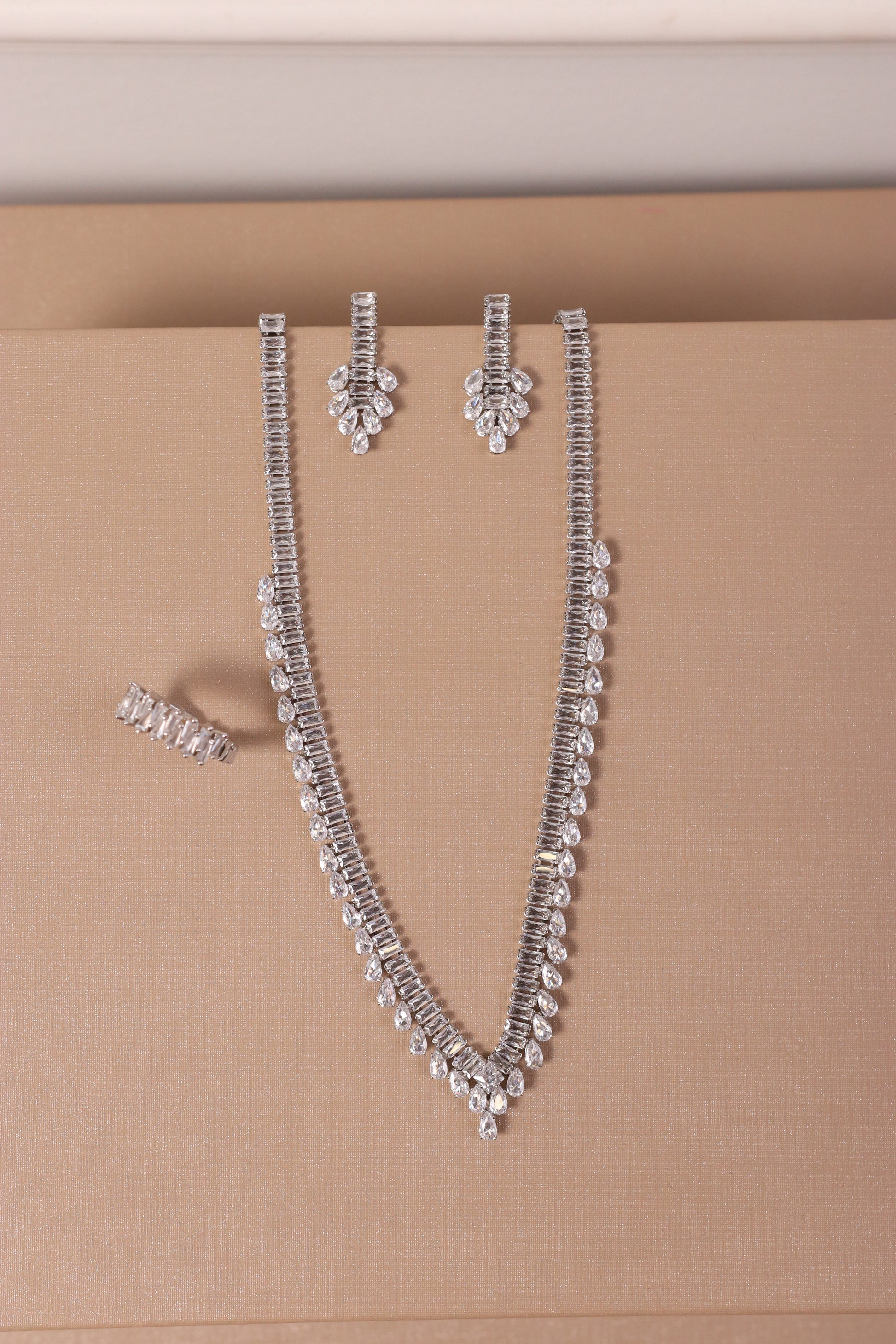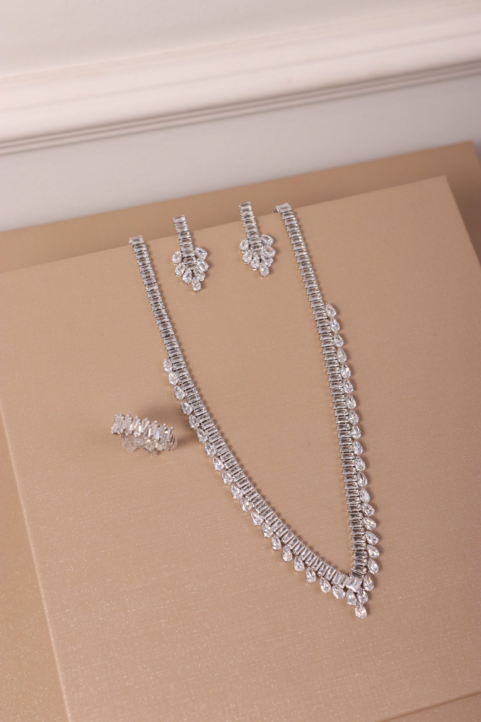 Um design sofisticado que une linhas geométricas com o brilho intenso das zircônias. O colar é formado por pedras retangulares cravejadas em sequência, finalizado com delicadas gotas de cristal que trazem movimento e luminosidade. Os brincos seguem o mesmo padrão elegante, enquanto o anel completa o conjunto com imponência e muito brilho.